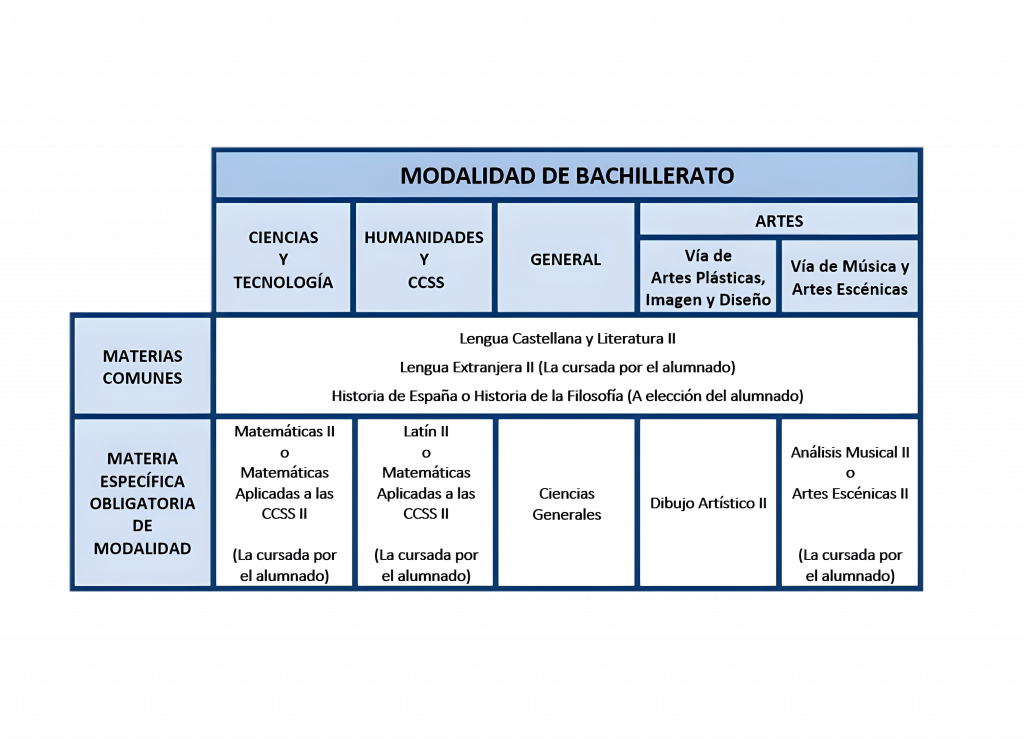 El alumnado tendrá que realizar obligatoriamente cuatro pruebas, correspondientes a tres materias comunes y a la materias específica obligatoria de la modalidad, y en su caso vía, cursada por el alumno o alumna en 2º de Bachillerato, según lo mostrado en la siguiente tabla: